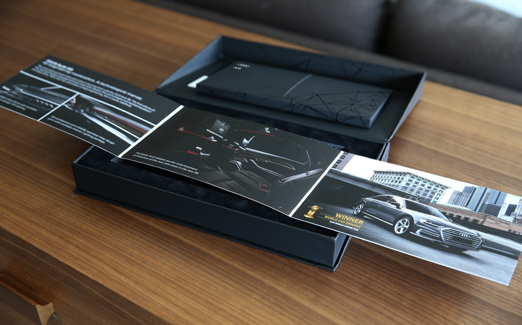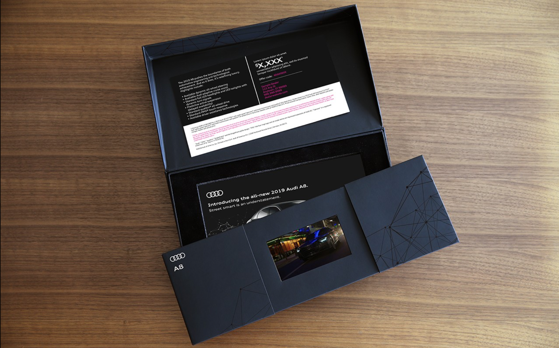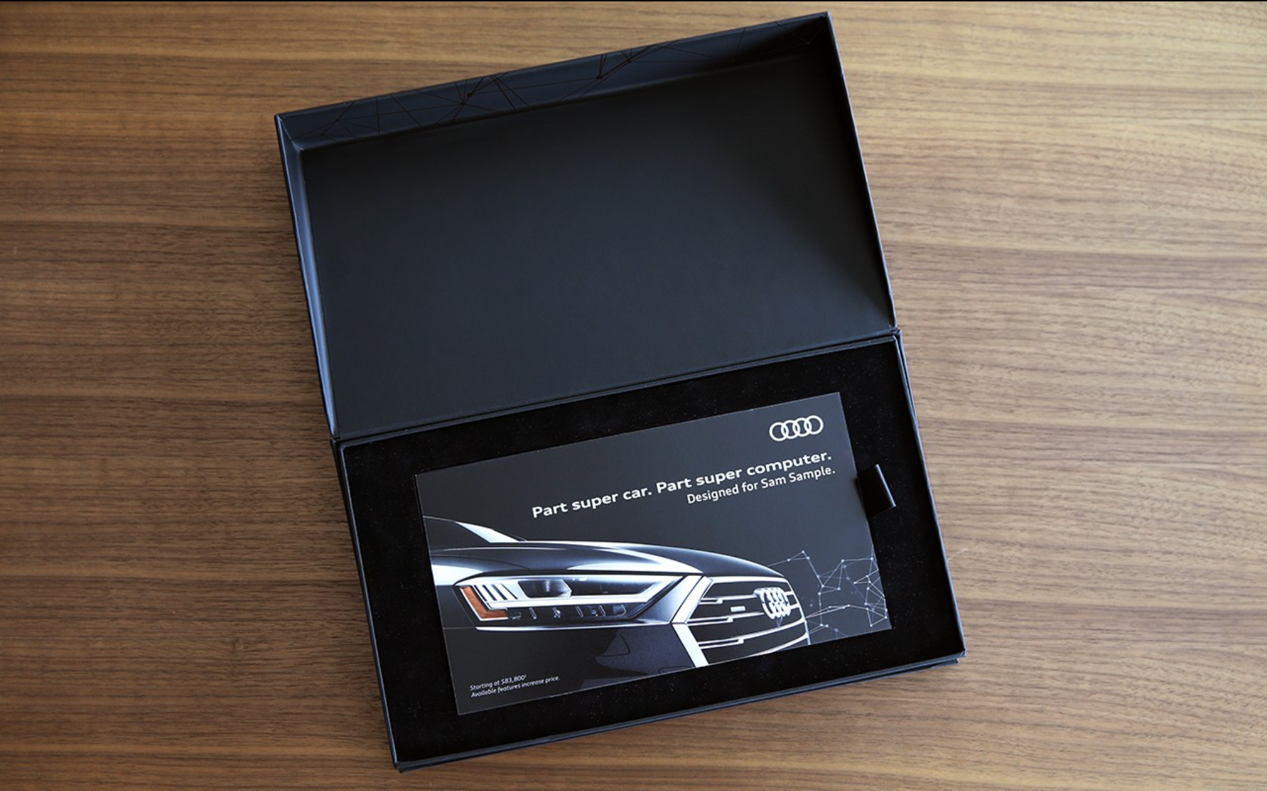 The A8 is the flagship vehicle for Audi and the all-new 2019 model was particularly important as the first in a new design language for the brand. Audi wanted to launch this vehicle in a manner consistent with the model's prestige. To appeal to potential A8 buyers, we created a premium direct mail package featuring an elegant black box, and consistent with the high-tech nature of the vehicle, it included a video player.
